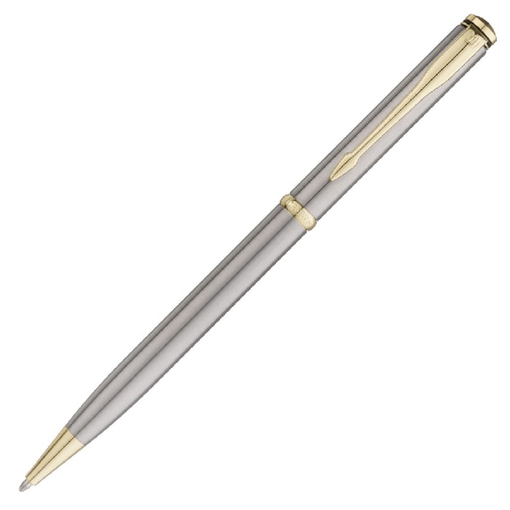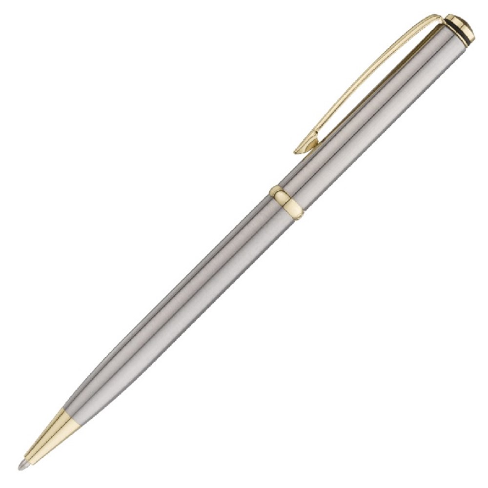 Prata com acabamento escovado e detalhes dourados tem sua escrita com conforto e maciez.