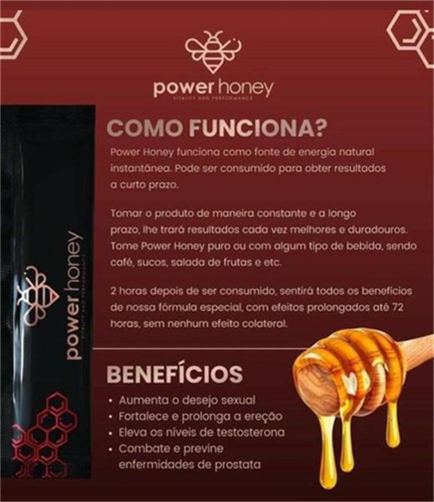 Detalhes do ProdutoPower Honey funciona como uma Fonte de Energia Natural instantânea. Pode ser consumido para obter resultados a curto prazo, porém tomar o produto de maneira constante e a longo prazo lhe trará resultados cada vez melhores e duradouros. Power Honey pode ser consumido puro, ou com algum tipo de bebida, café, sucos, salada de frutas e etc. 2 horas depois de ser consumido, sentira todos os benefícios de nossa fórmula especial, com efeitos prolongados até 72 horas, sem nenhum efeito colateral.Benefícios: Mais vitalidade no seu dia-a-dia Melhor desempenho físico e mental Aumento dos níveis de energia no corpo Rico em proteínas, aminoácidos, vitaminas. Contem enzimas digestivas e metabólicas Melhora a absorção de nutrientes e o metabolismo Ajuda o sistema imunológico Ajuda na formação da musculatura corporal Melhora a memoria e as funções cerebrais Reduz a insônia e ajuda a regular o sono